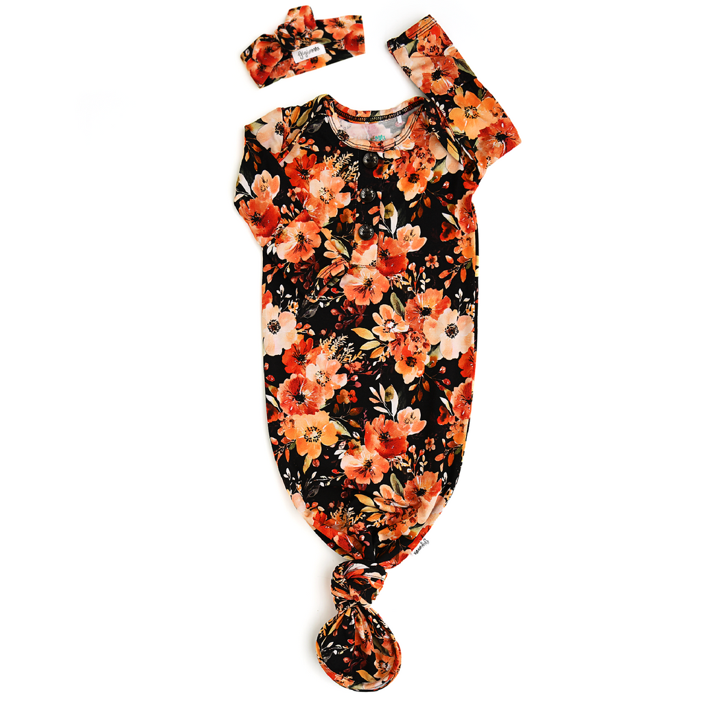 This listing is for a Newborn Sized super soft and stretchy knotted baby gown. Matching headband can be purchased along with the gown in the dropdown of this listing.