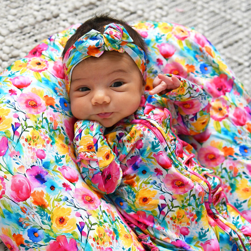 Mitten cuff on arm keeps baby from scratching, if needed. Fold-over foot at ankle can be used on chilly days when you forgot the socks! Please note: newborn size is footed.