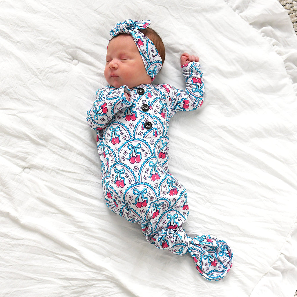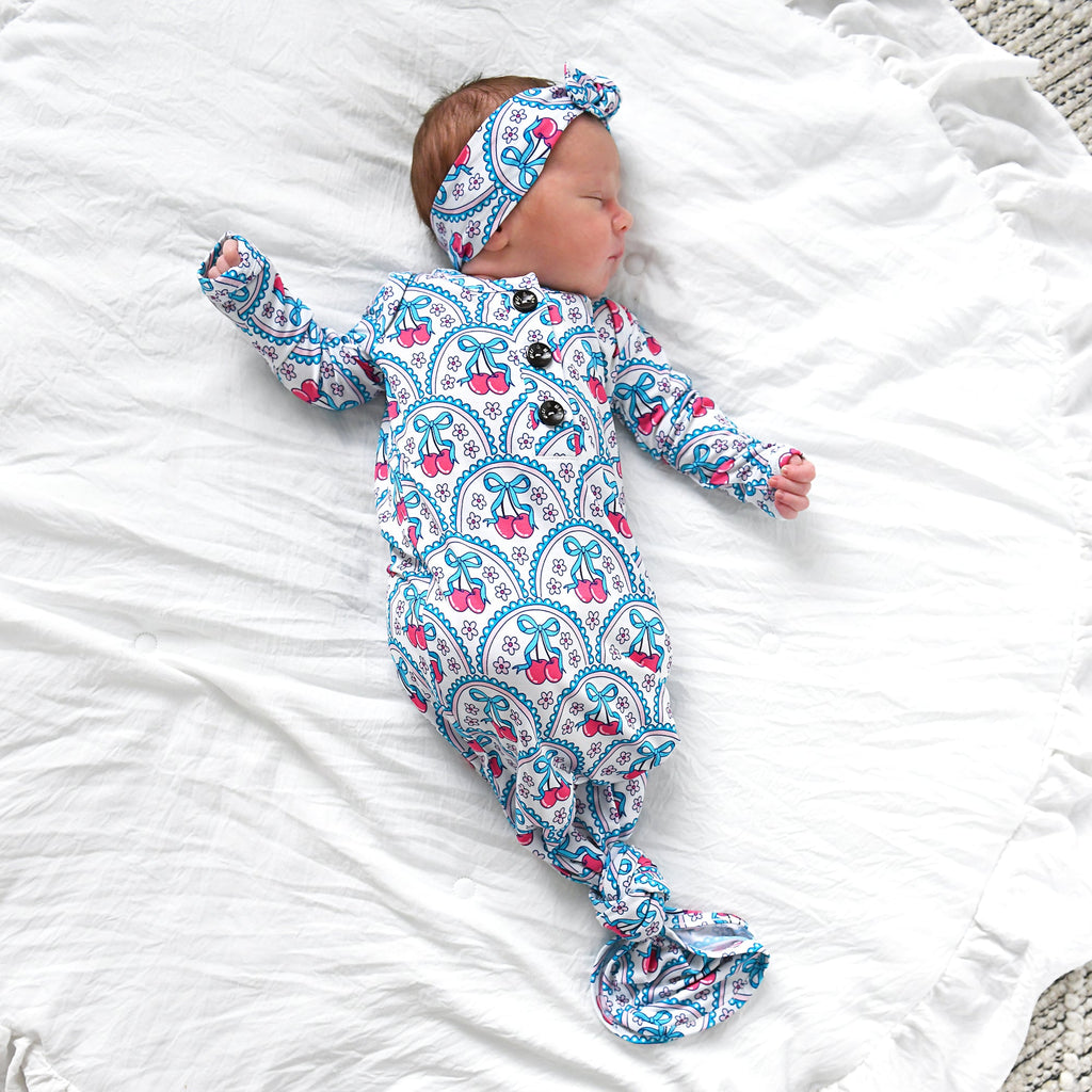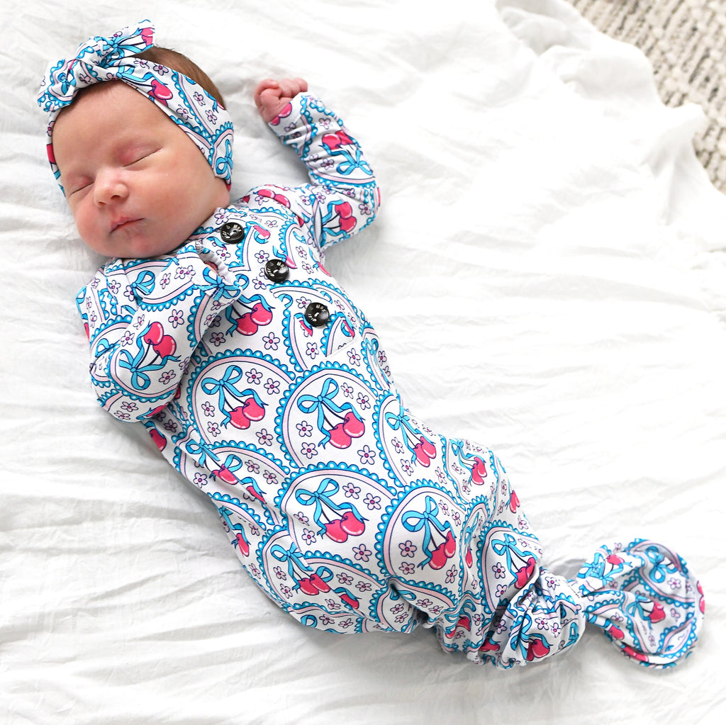 This listing is for a Newborn Sized super soft and stretchy knotted baby gown. Matching headband can be purchased along with the gown in the dropdown of this listing.