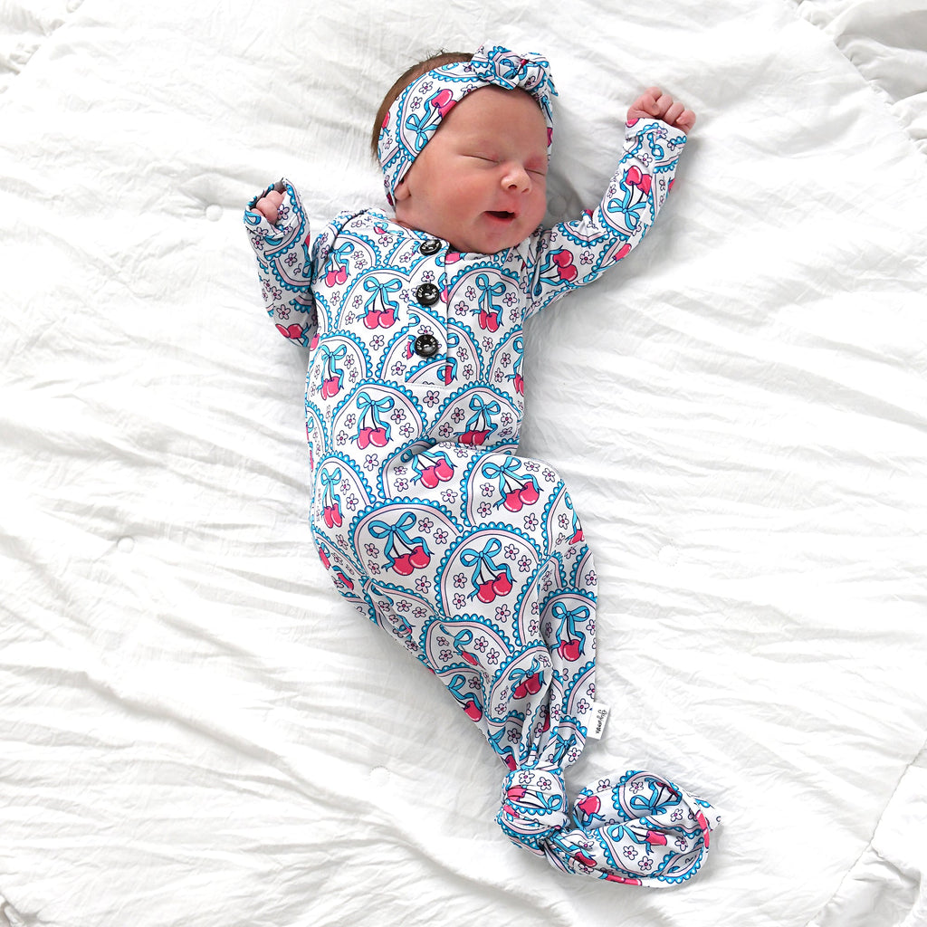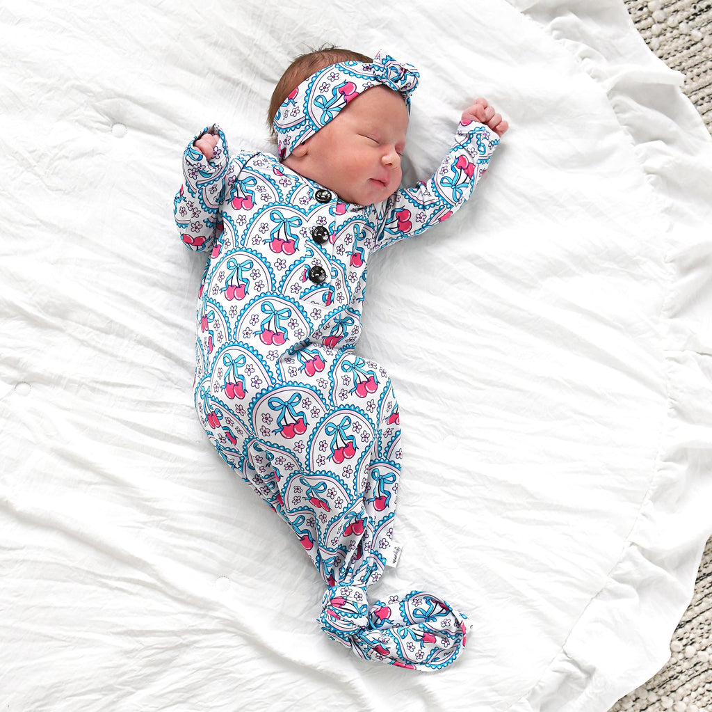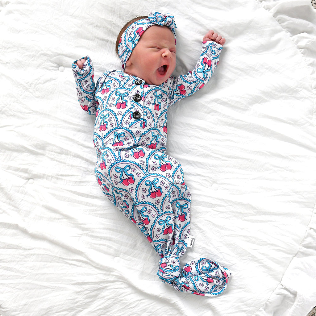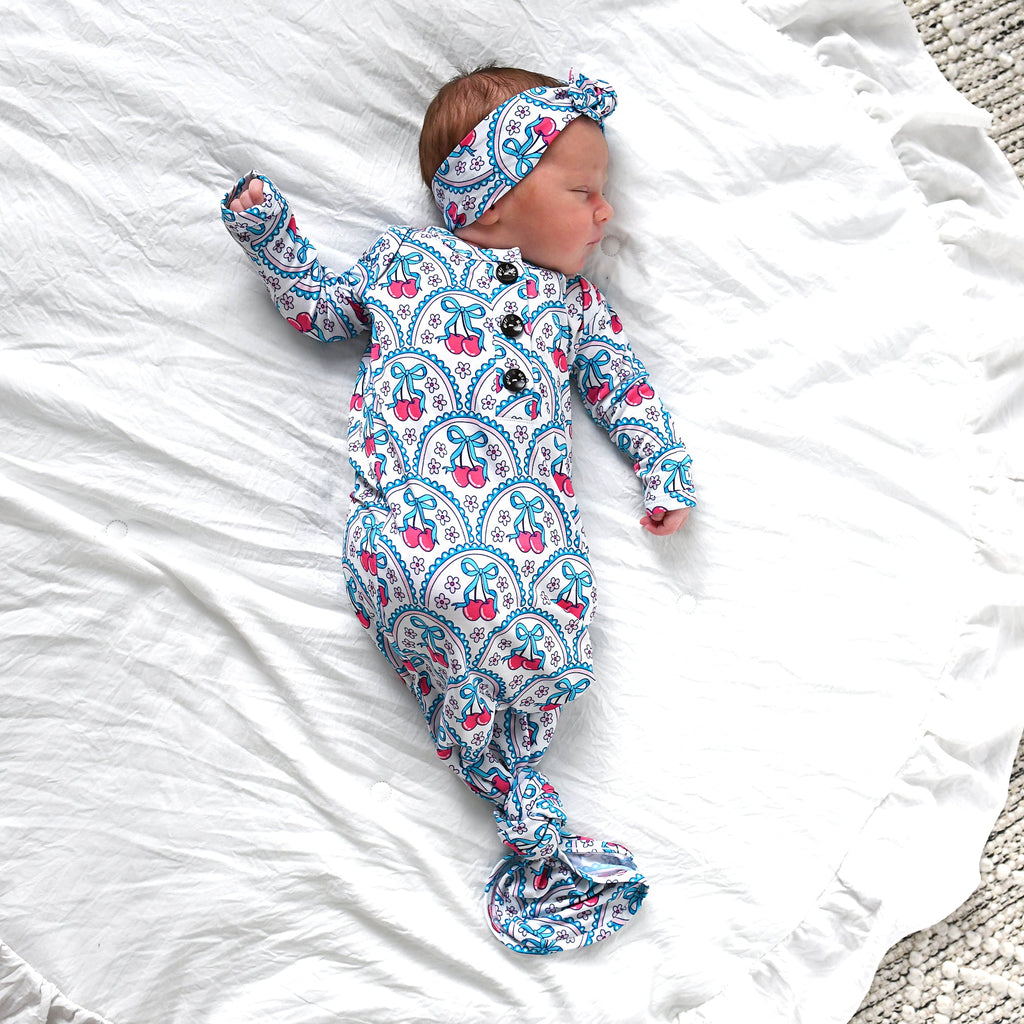 This listing is for a Newborn Sized super soft and stretchy knotted baby gown. Matching headband can be purchased along with the gown in the dropdown of this listing.