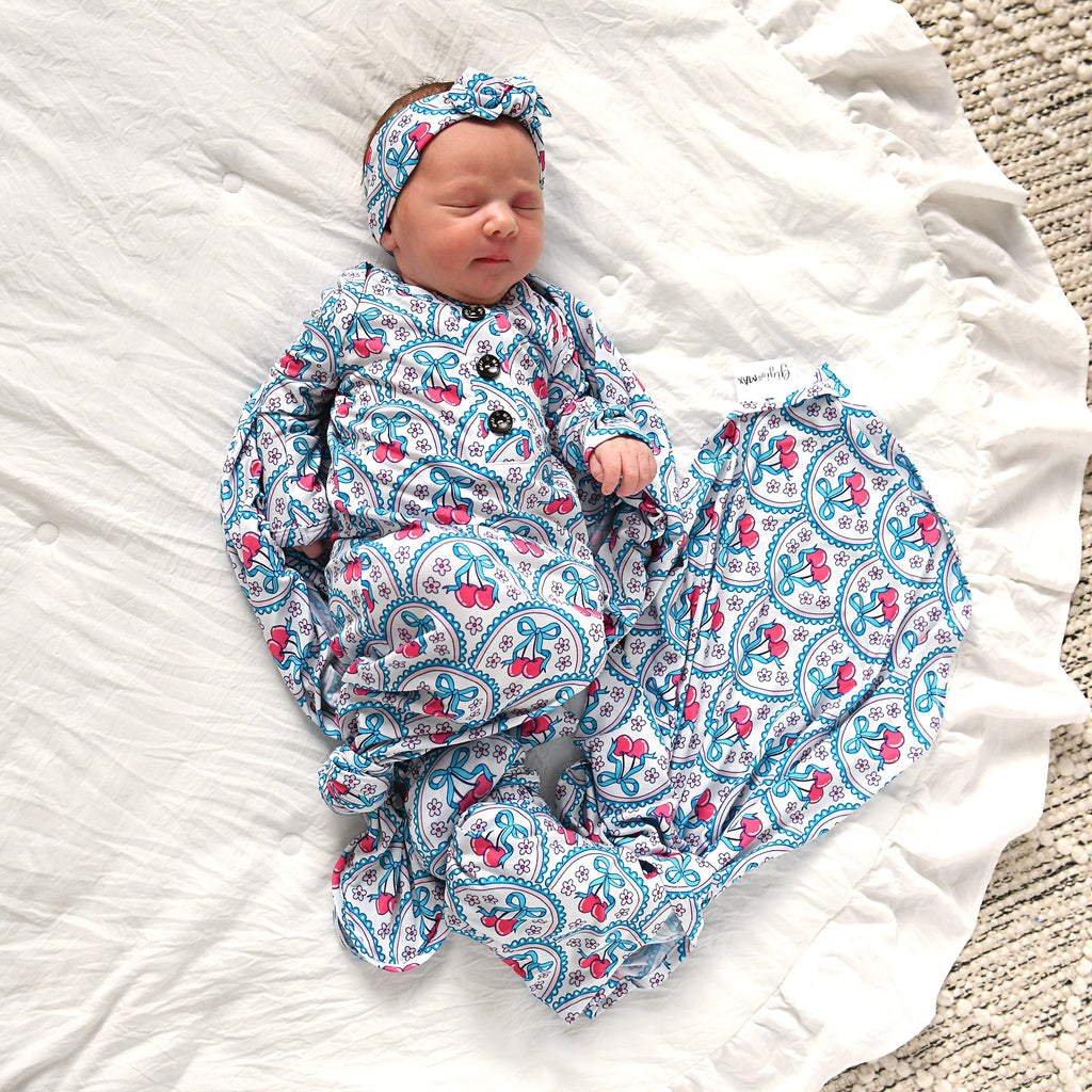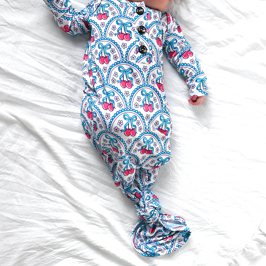 Coordinating buttons and the slits at the shoulder make taking on and off baby from the top down very easy! Knot on the gown can be tied and untied as needed for quick diaper changes!