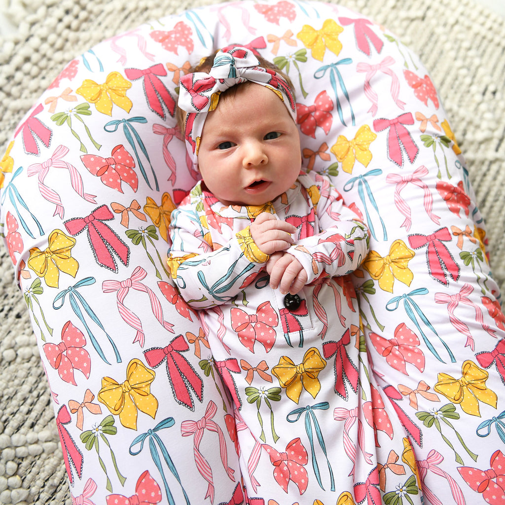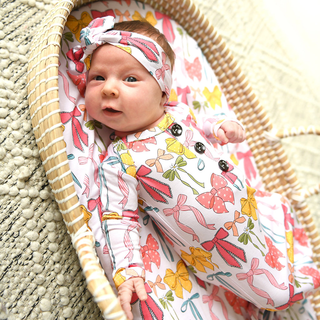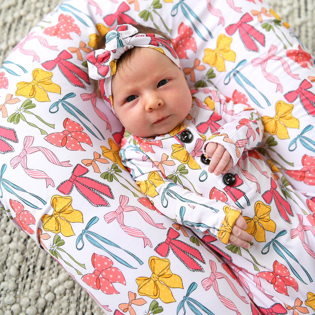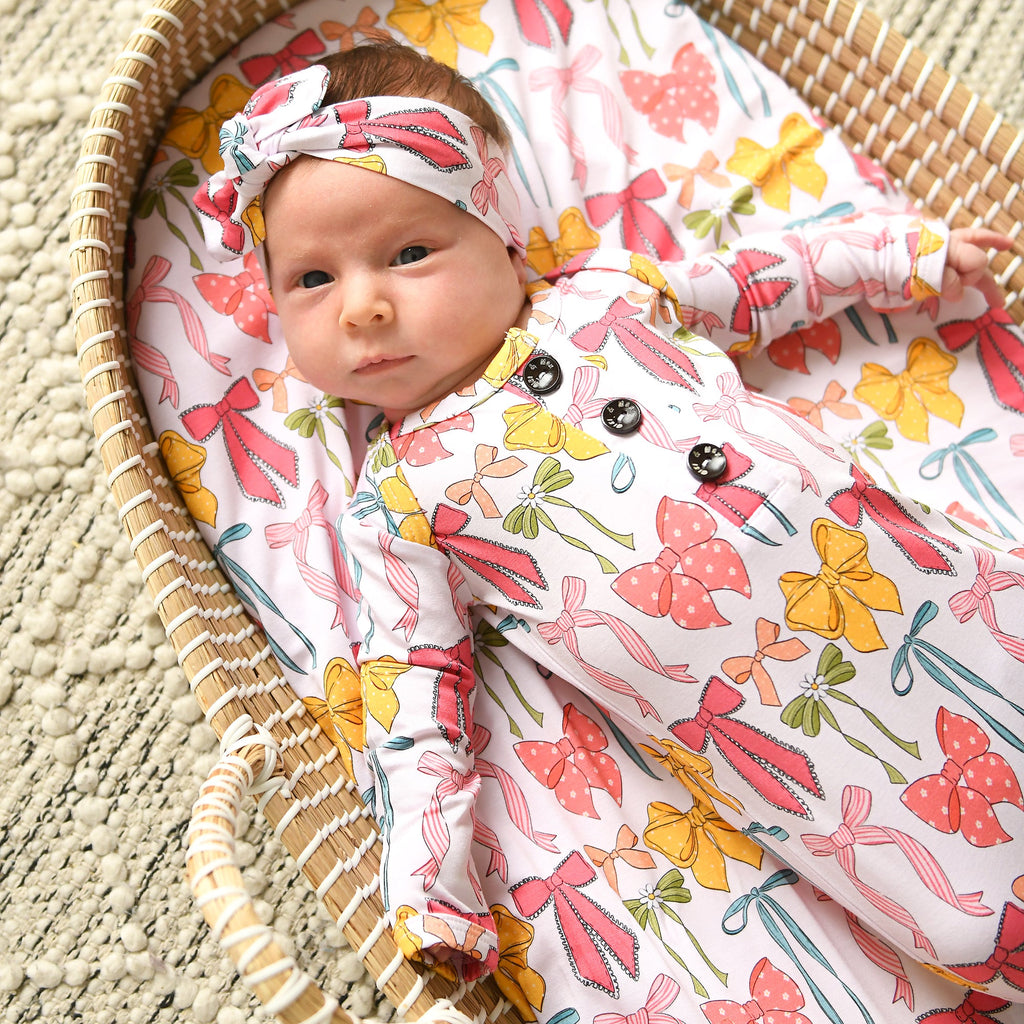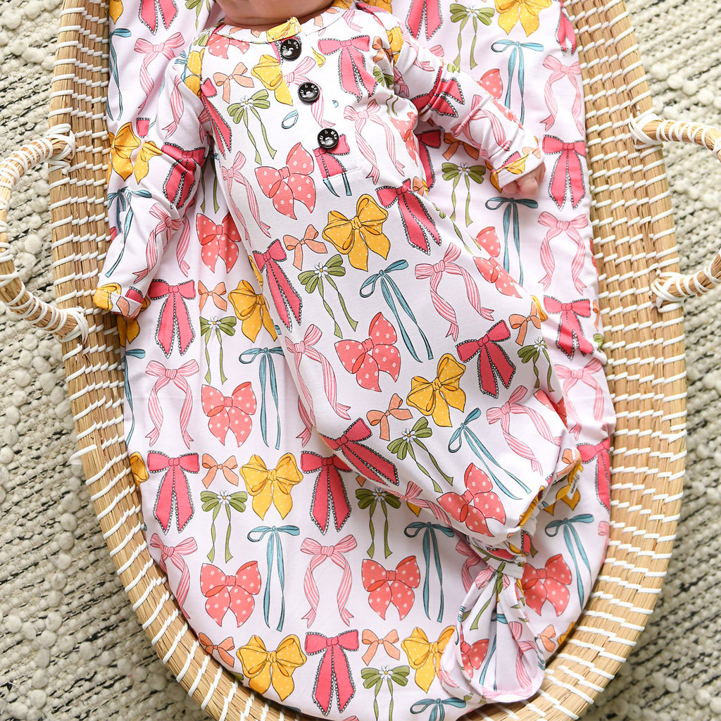Coordinating buttons and the slits at the shoulder make taking on and off baby from the top down very easy! Knot on the gown can be tied and untied as needed for quick diaper changes!