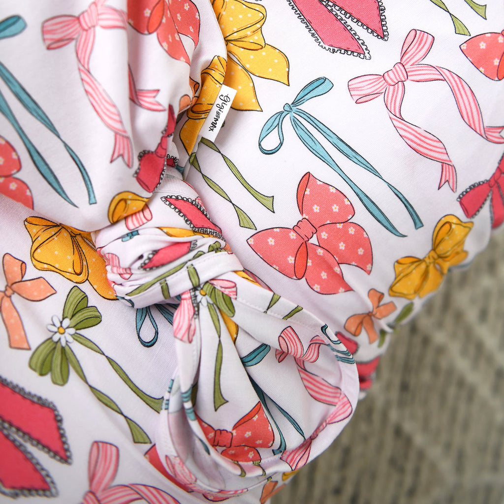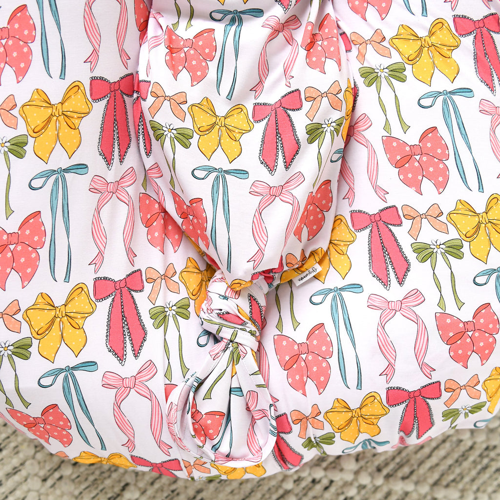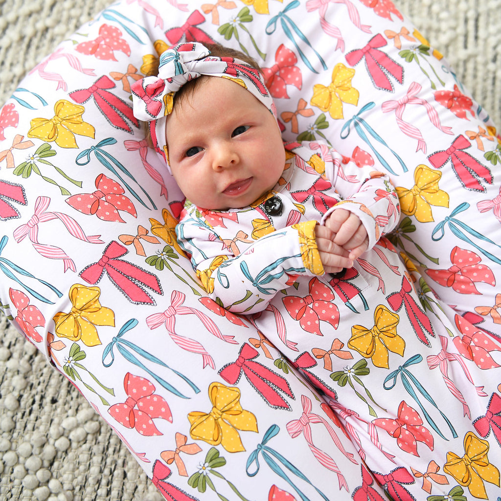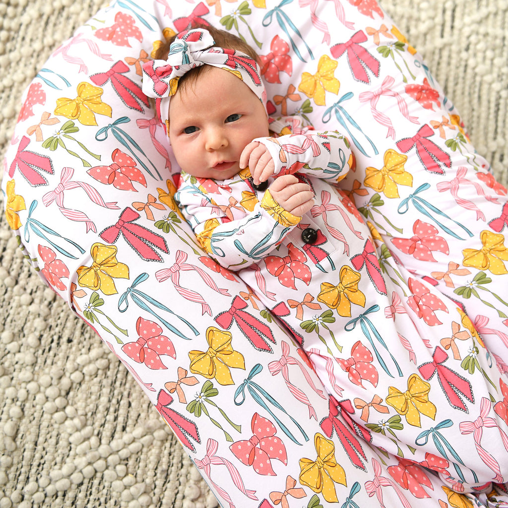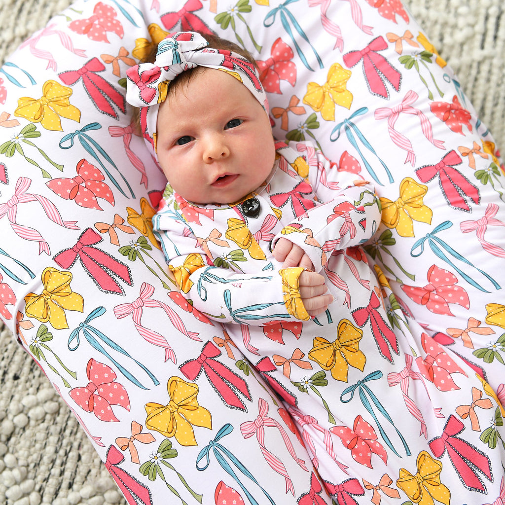 Coordinating buttons and the slits at the shoulder make taking on and off baby from the top down very easy! Knot on the gown can be tied and untied as needed for quick diaper changes!