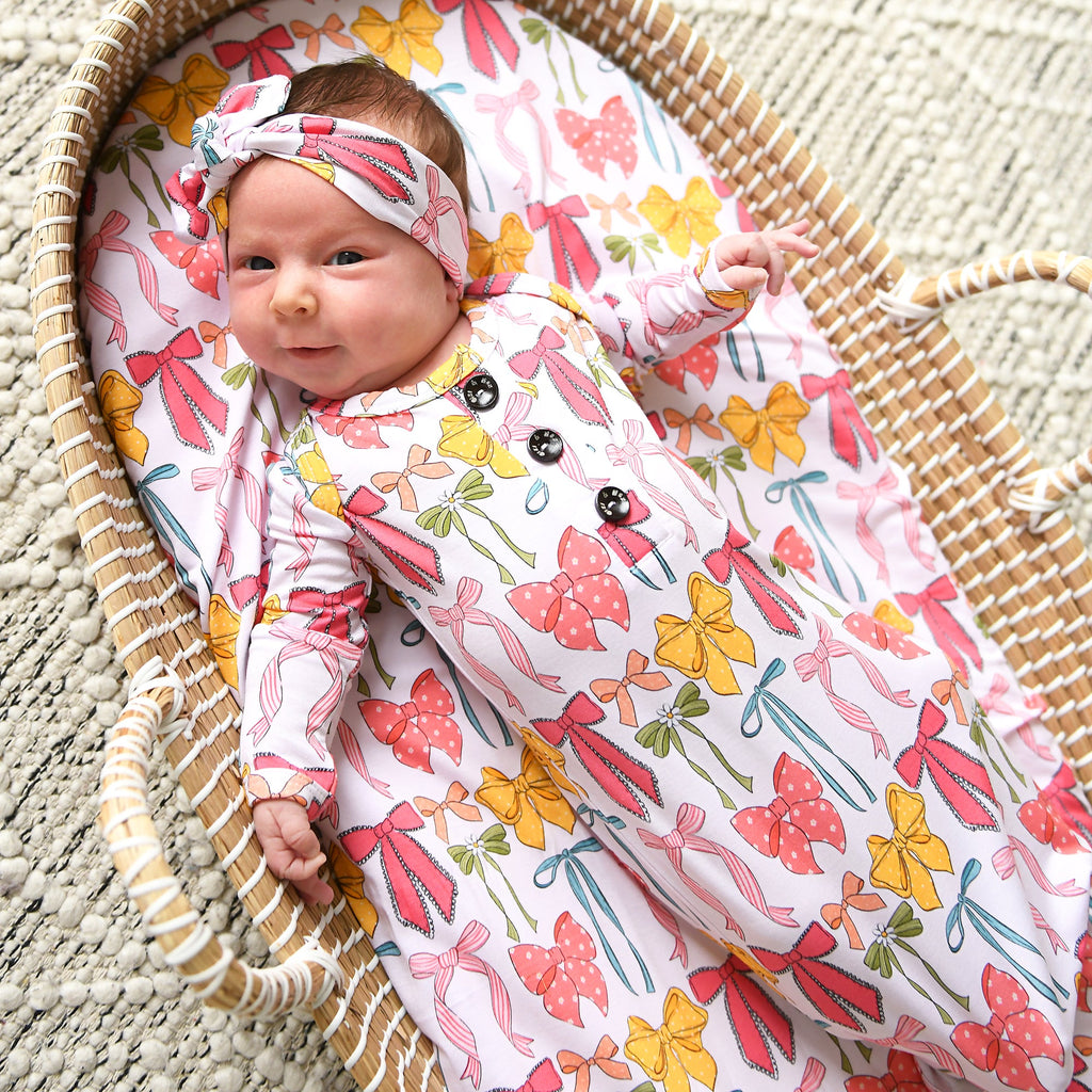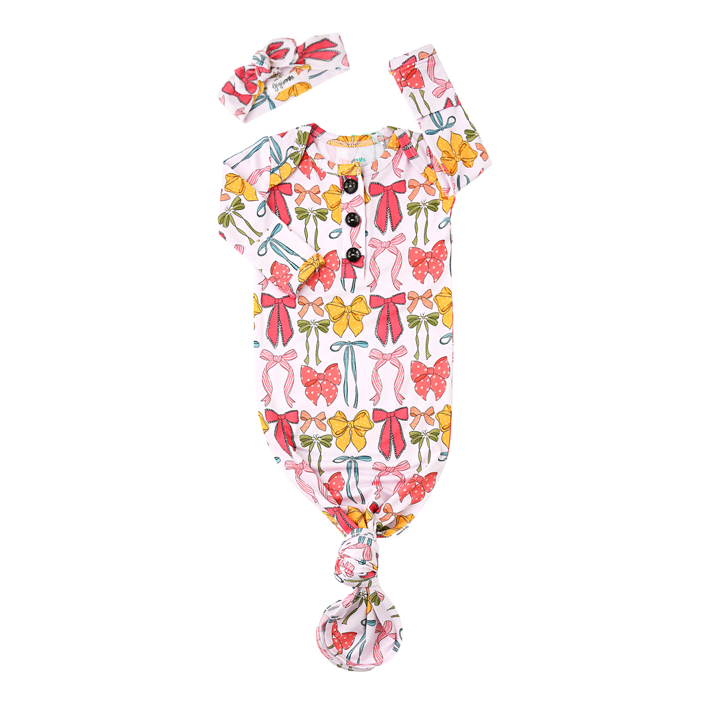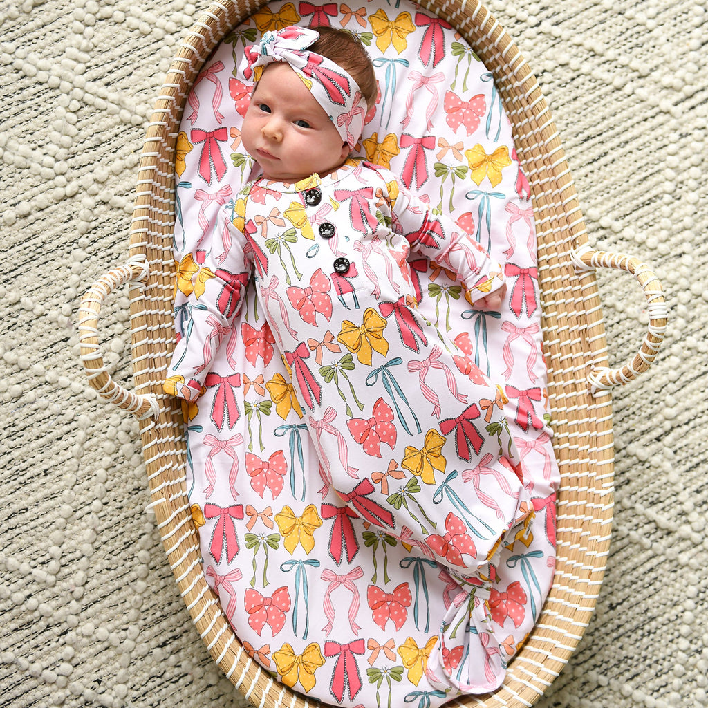 This listing is for a Newborn Sized super soft and stretchy knotted baby gown. Matching headband can be purchased along with the gown in the dropdown of this listing.