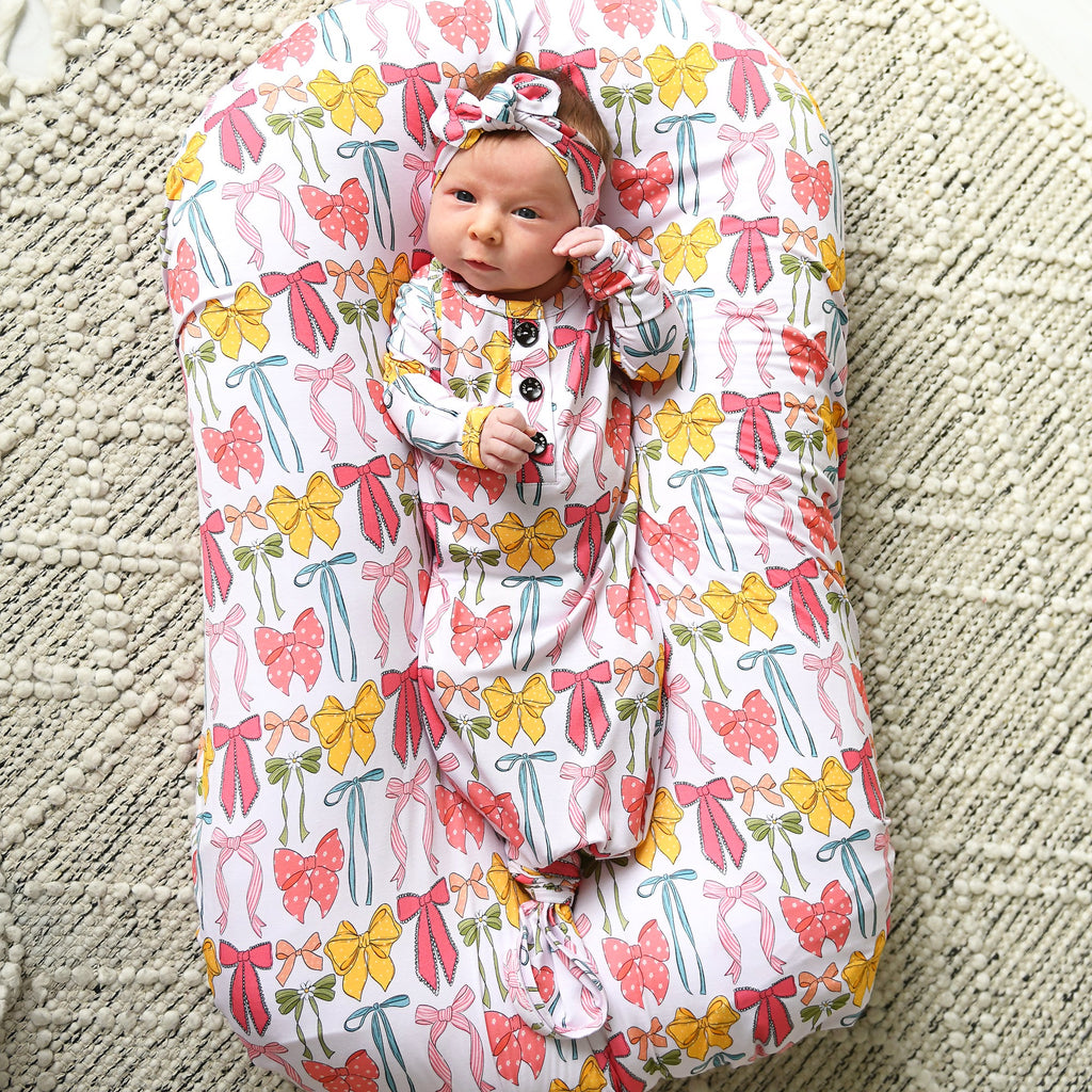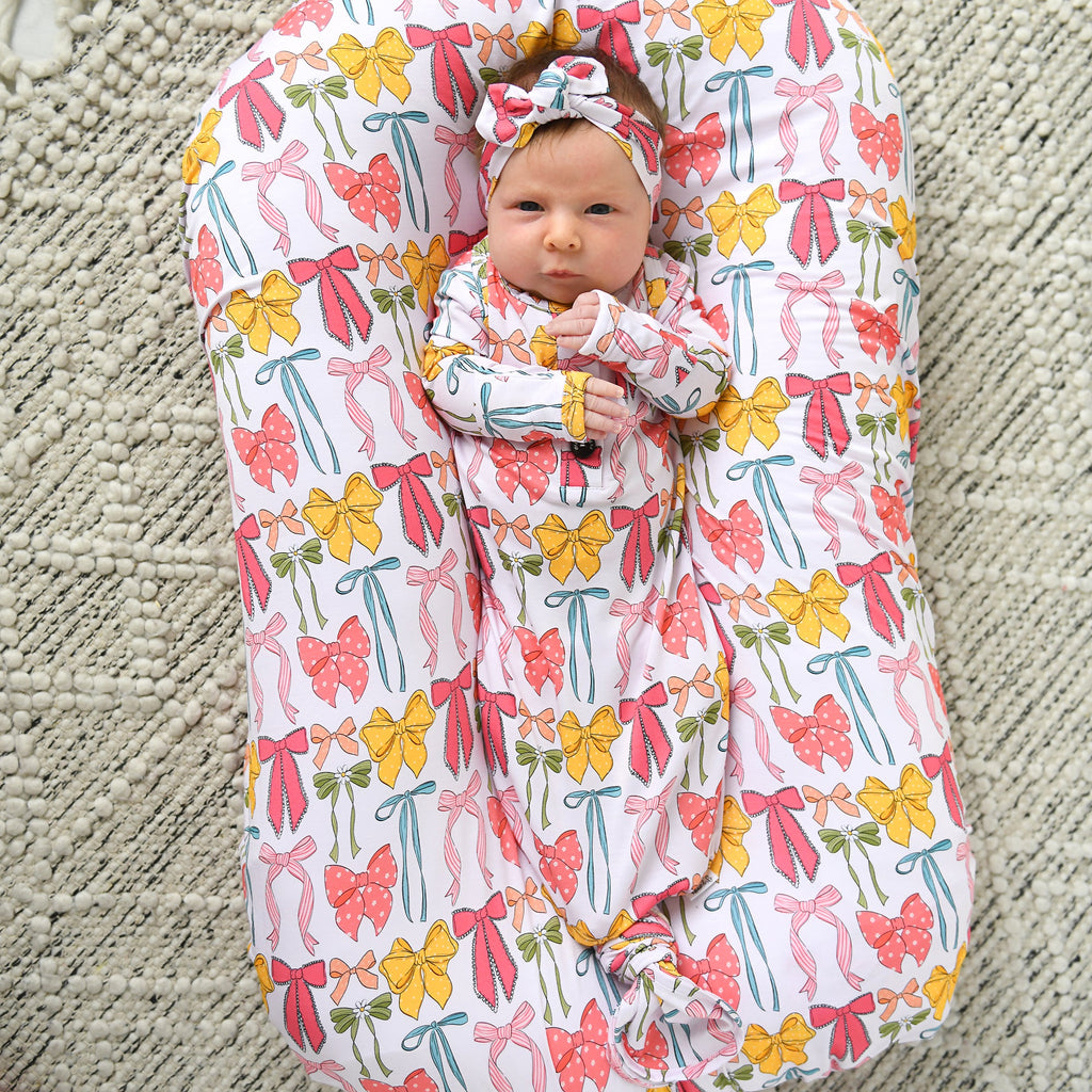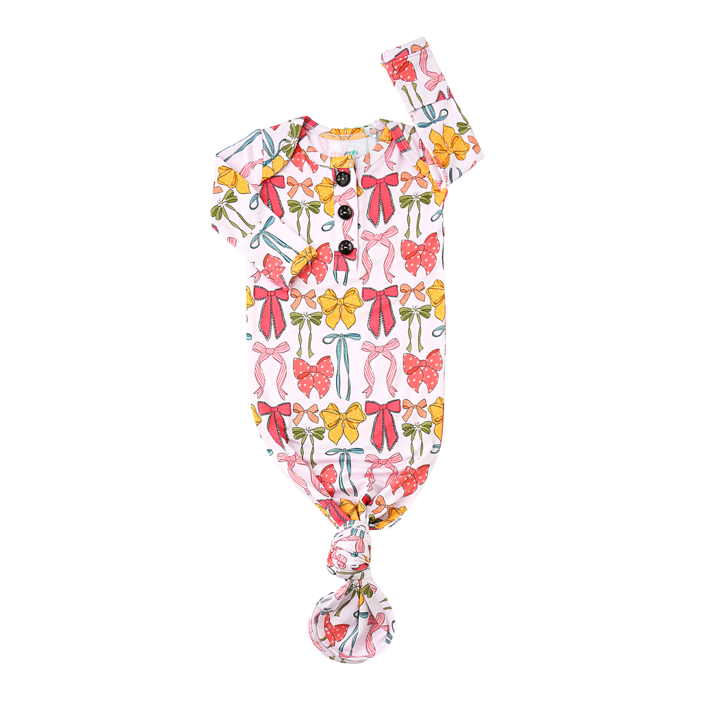 This listing is for a Newborn Sized super soft and stretchy knotted baby gown. Matching headband can be purchased along with the gown in the dropdown of this listing.