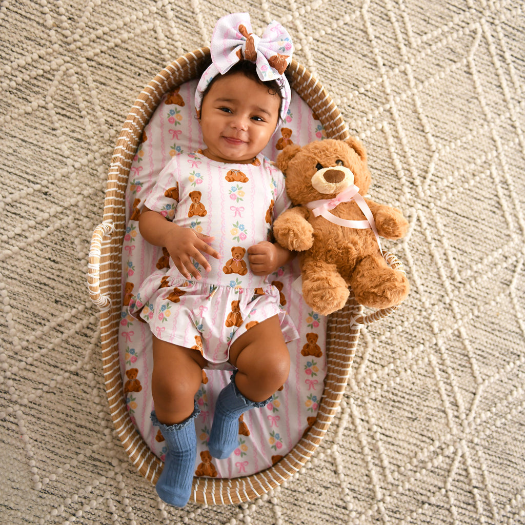 Due to the differing fabric, the coloring in the bow is not an exact match to our bamboo clothing.