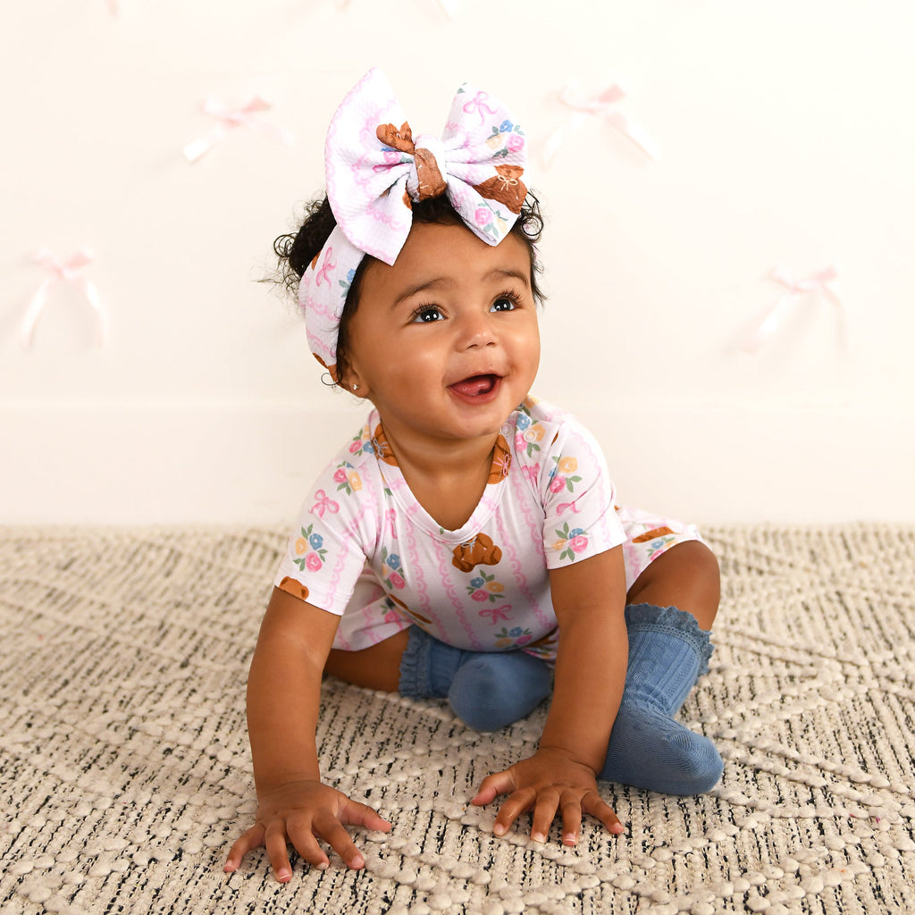 This beautiful headwrap is the perfect accessory for your sweet baby! Made from bullet fabric, a poly/spandex blend, it is super soft and stretchy!