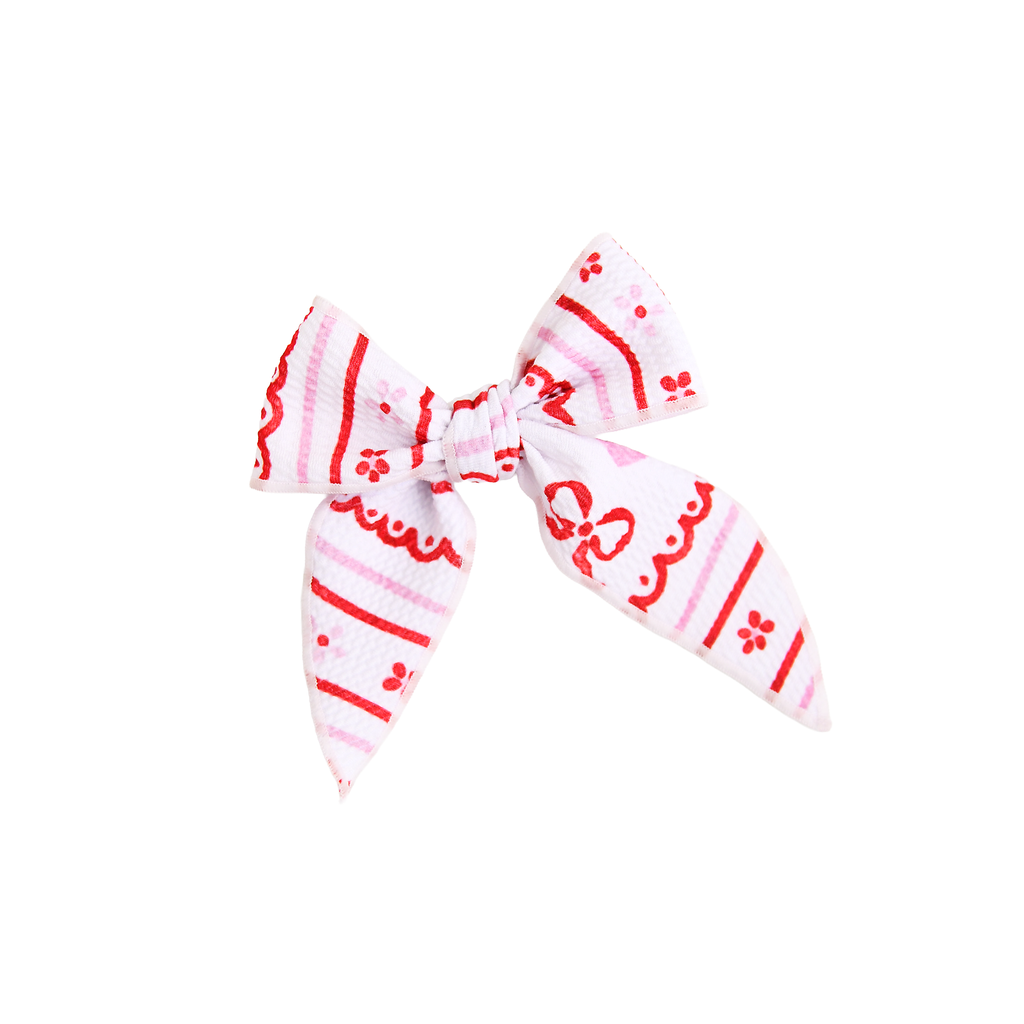 Our adorable clip bow is made from soft, textured bullet fabric and features a sturdy alligator clip on the back- ideal for side parts, ponytails, or any sweet hairstyle.