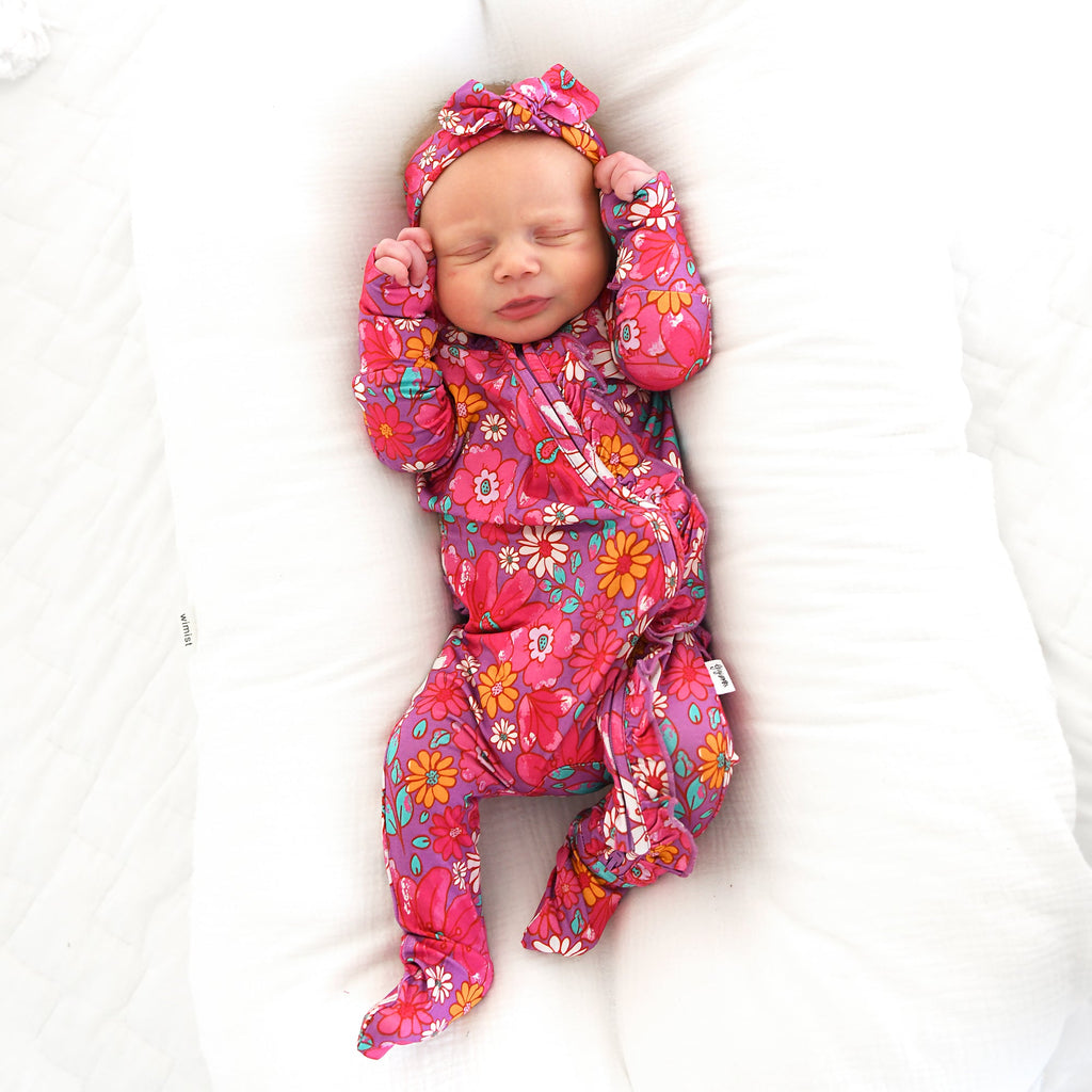 Mitten cuff on arm keeps baby from scratching, if needed. Fold-over foot at ankle can be used on chilly days when you forgot the socks! Please note: newborn size is footed.