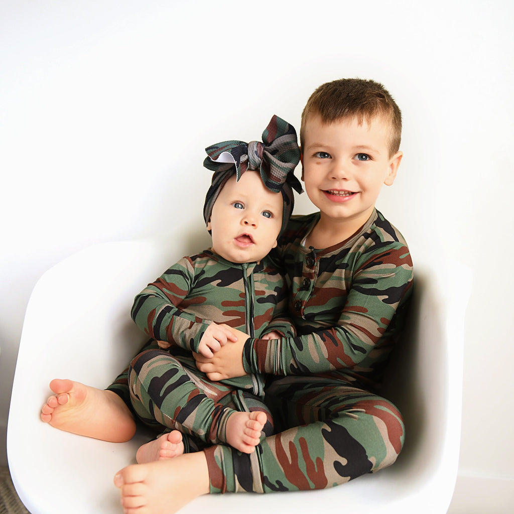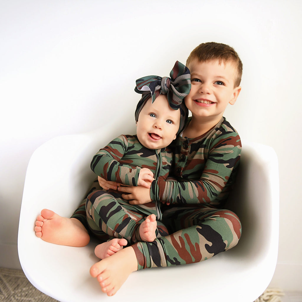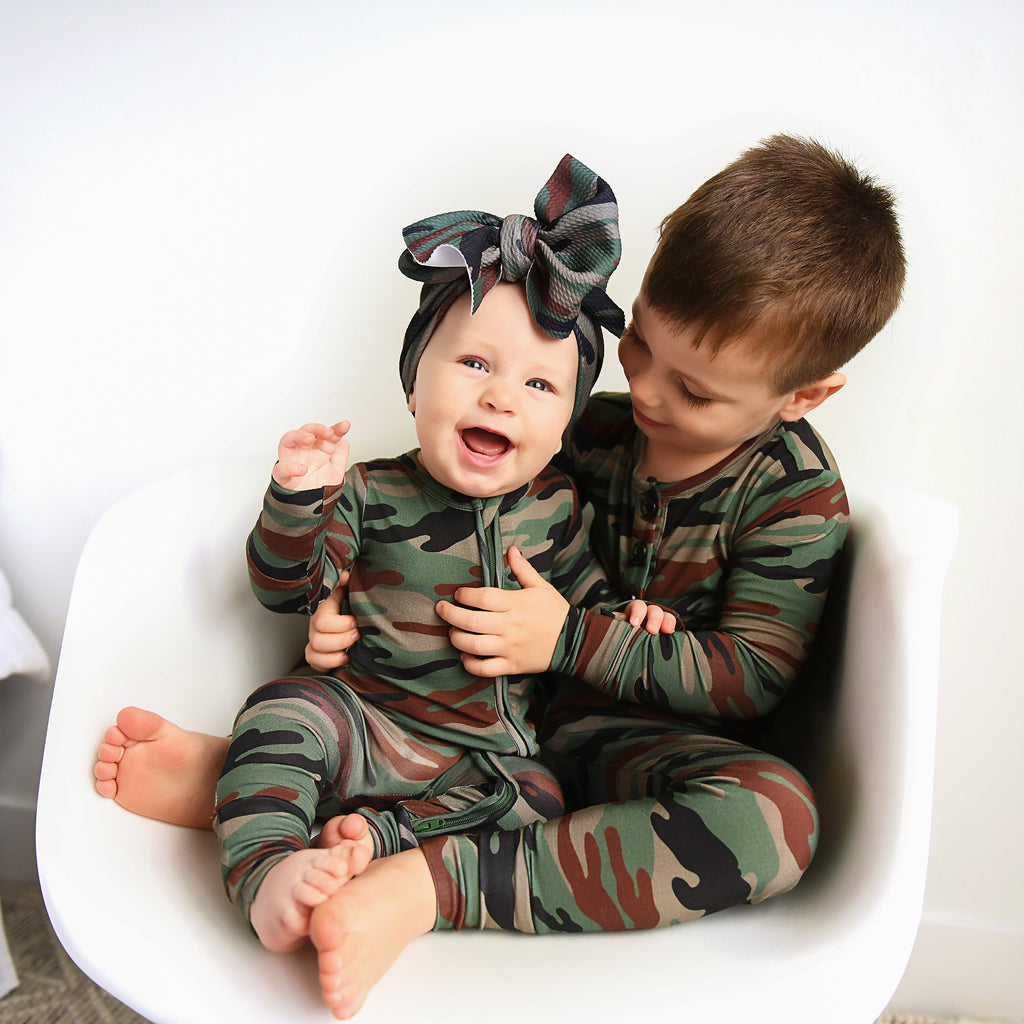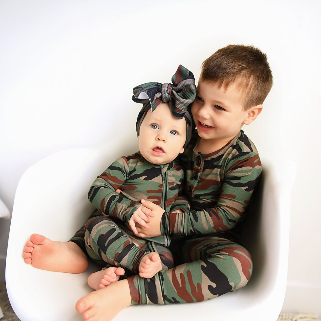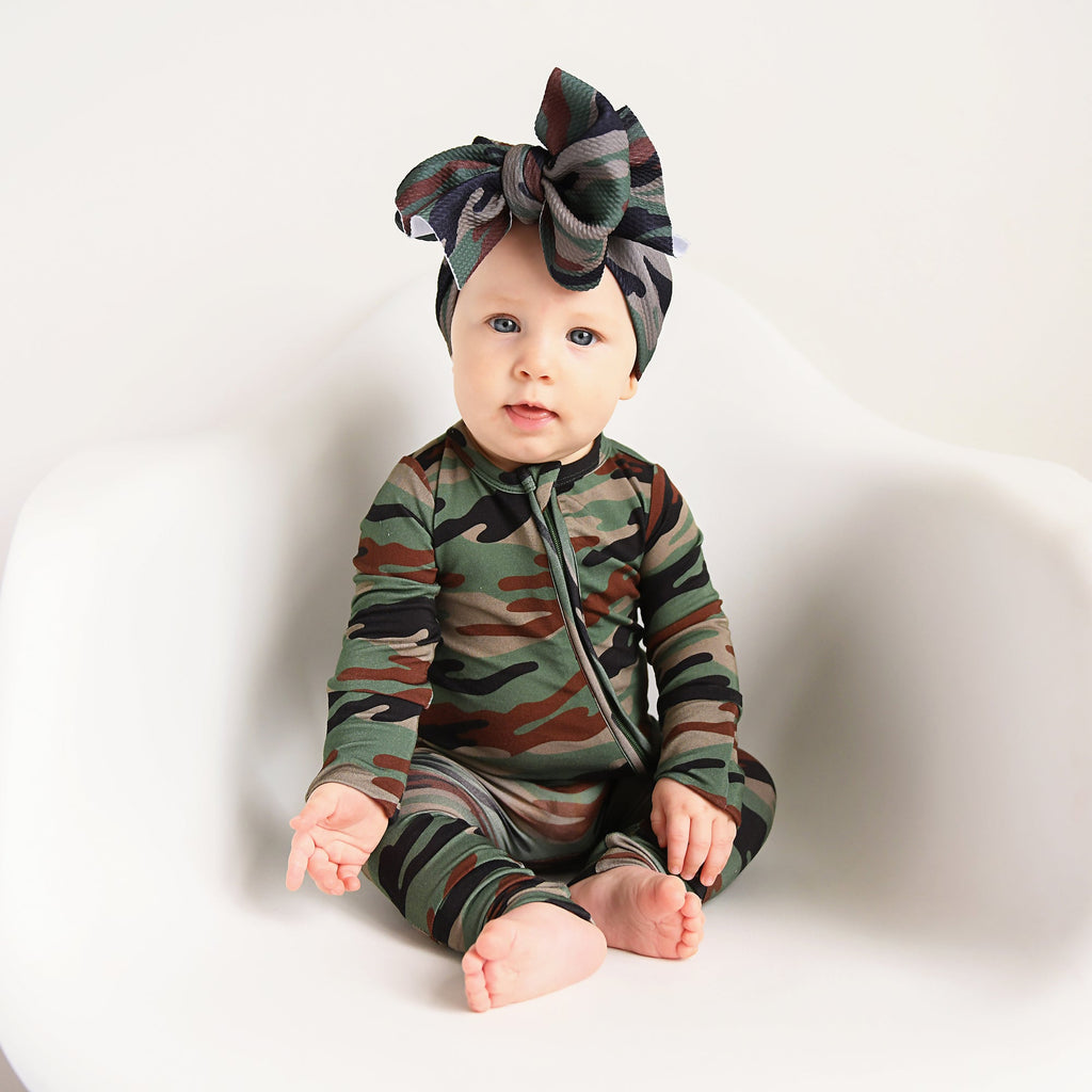 Due to the differing fabric, the coloring in the bow is not an exact match to our bamboo clothing.