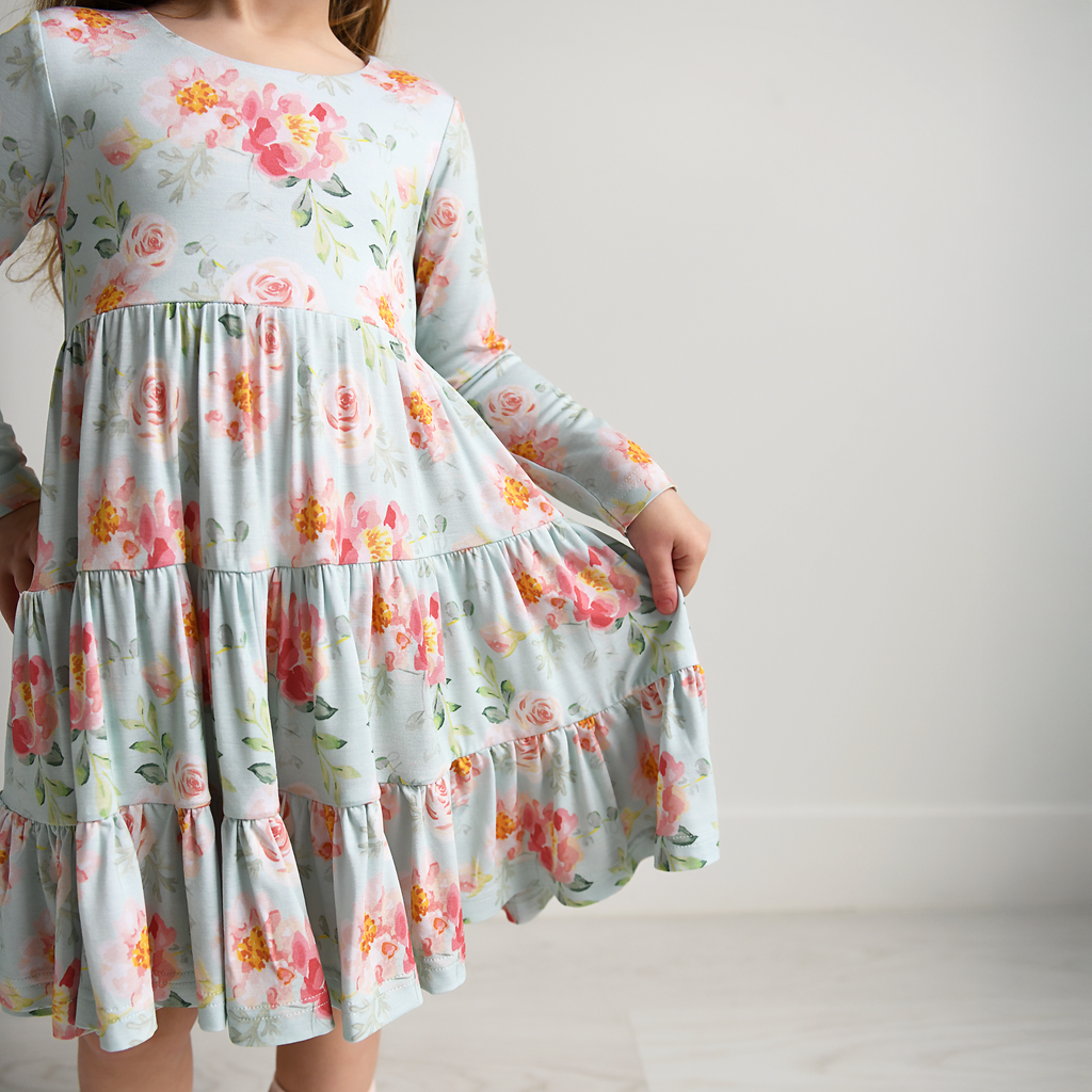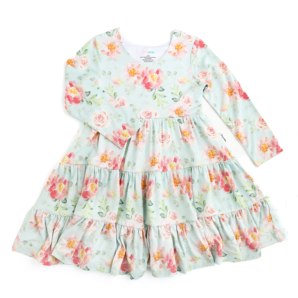 This adorable swing dress is a must have for your cutie, it's perfect for twirling, super soft and so comfortable! Snaps at the shoulder make taking on and off very easy! Bodice is double lined. The tiered skirt is absolutely beautiful.